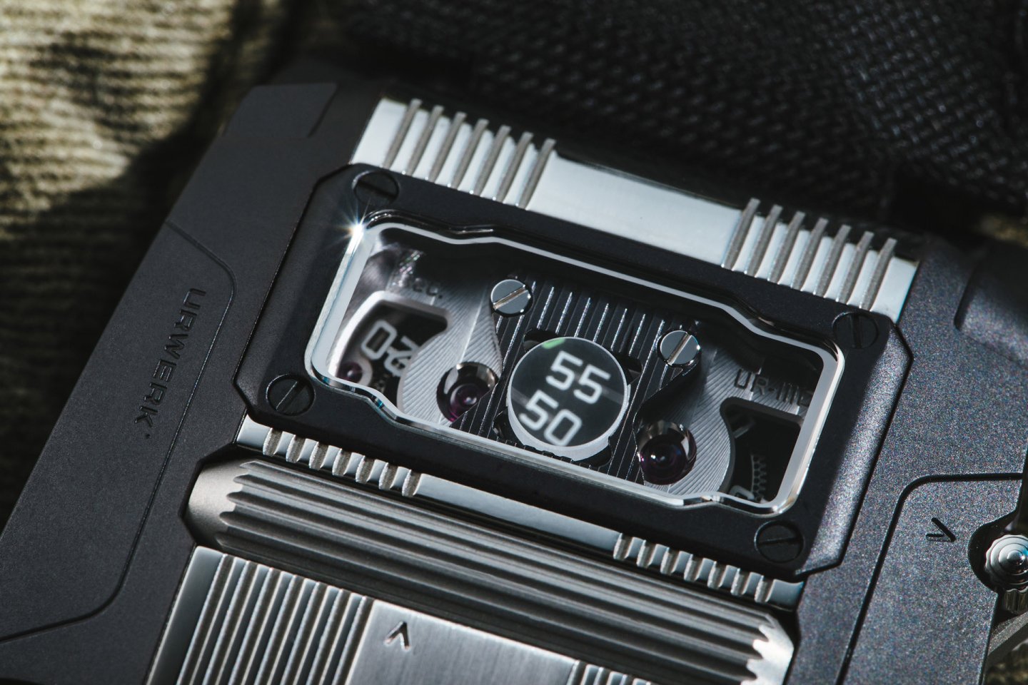 The UR-111C’s digital seconds are mounted alternately on two tiny wheels. Each openwork seconds wheel weighs 0.018 grams (0.025g with numerals) — miniature lacework in metal thanks to the LIGA process.