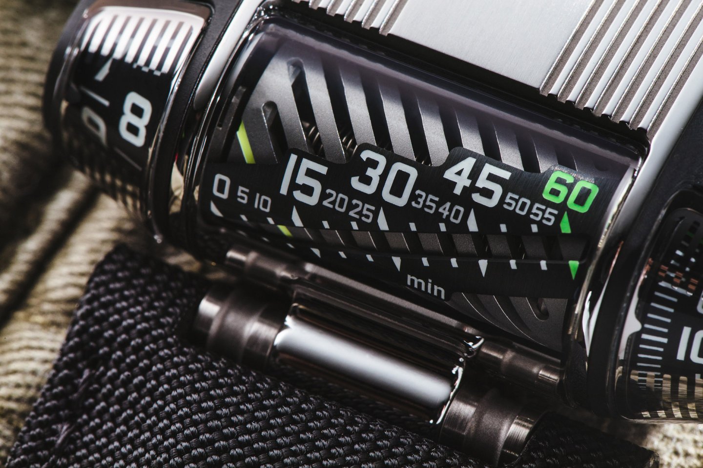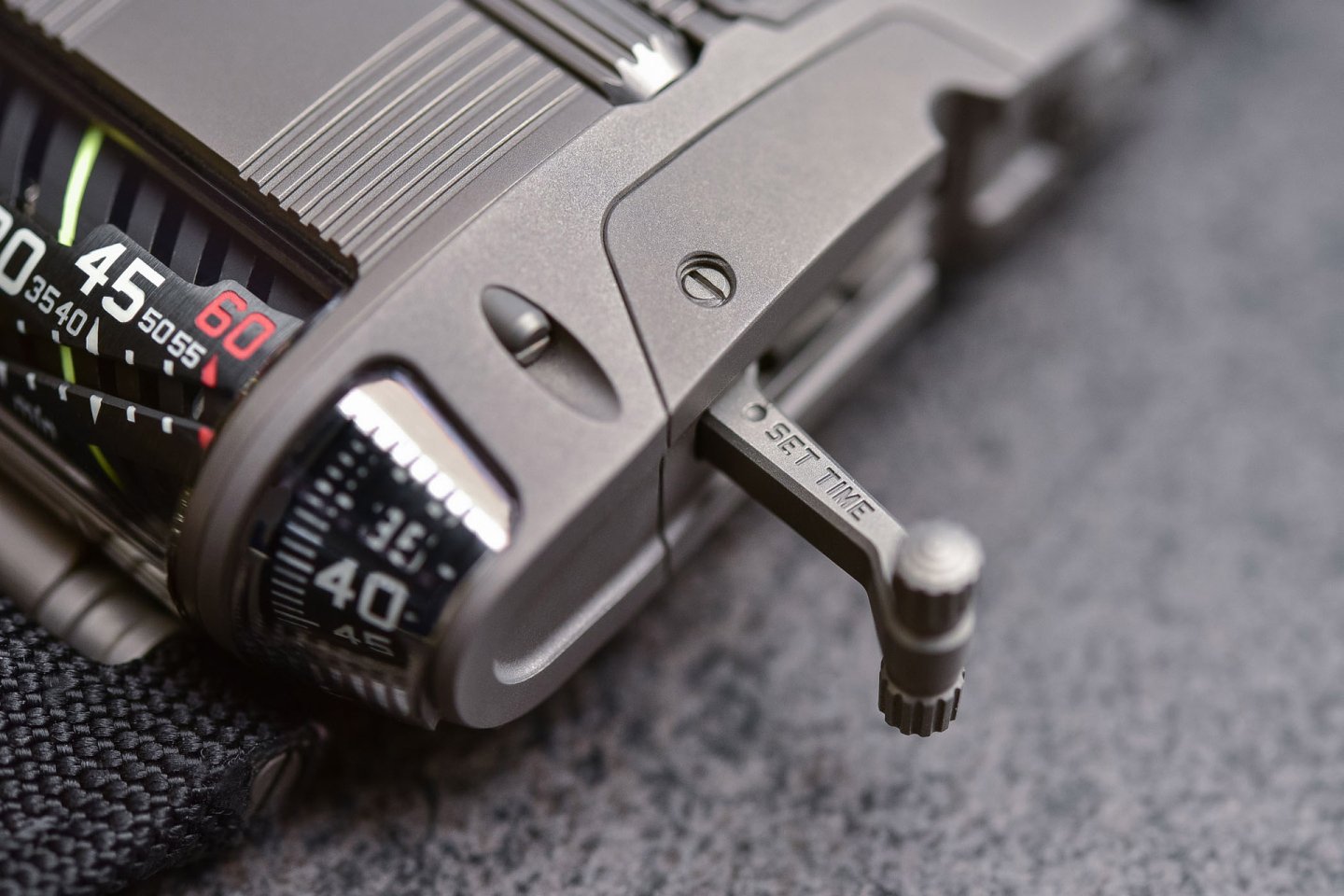 Instead of the conventional crown at the end of the stem, URWERK conceived a roller integrated into the top of the case above and parallel to the winding stem. Bevel gears for 90° transmission –