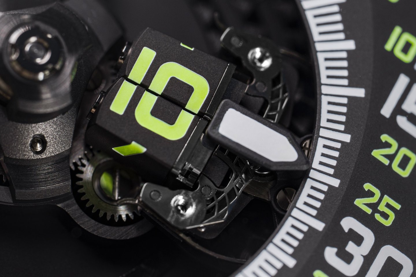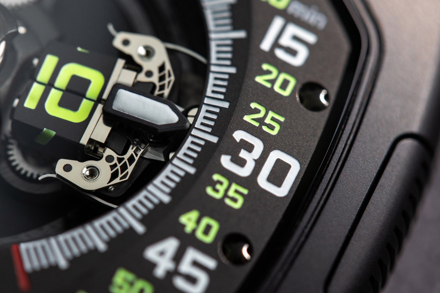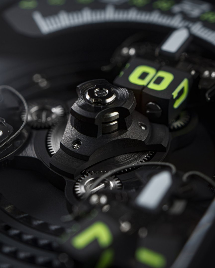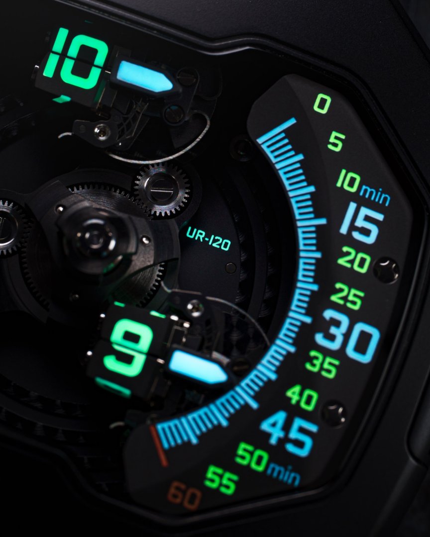 The UR-120 is a new stage in the constant mutation of the URWERK species. This UR-120 furthers the codes of the UR-110 collection and reshapes its concept. The idea was to go in a thinner, smoother, more elegant direction. To do that, we redesigned the entire satellite system. Each satellite is now made of two sub-elements to make it thinner, easier to read and to give it unprecedented fluidity.
