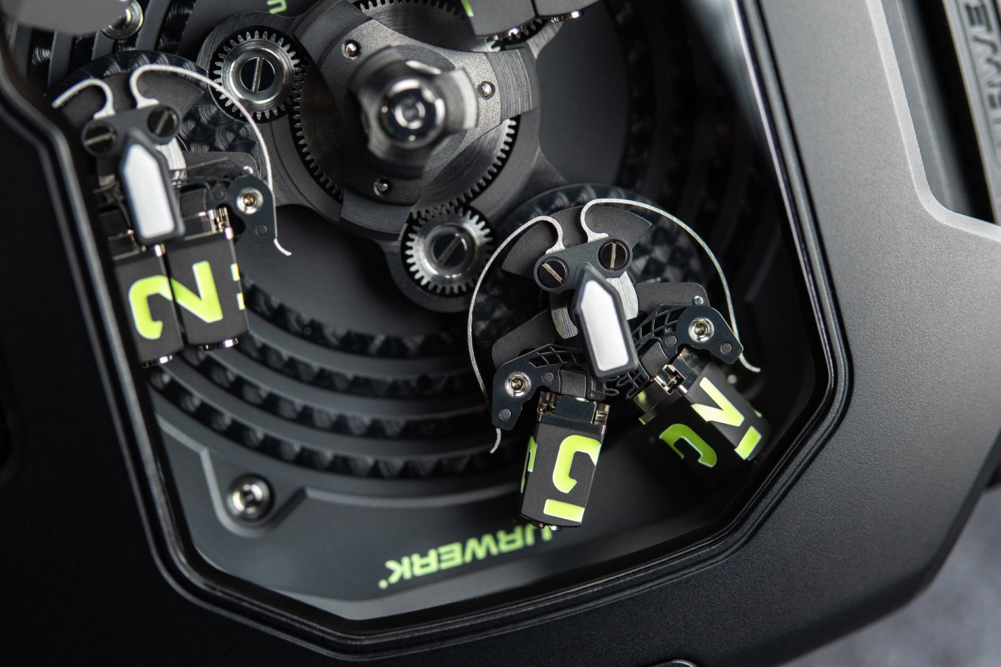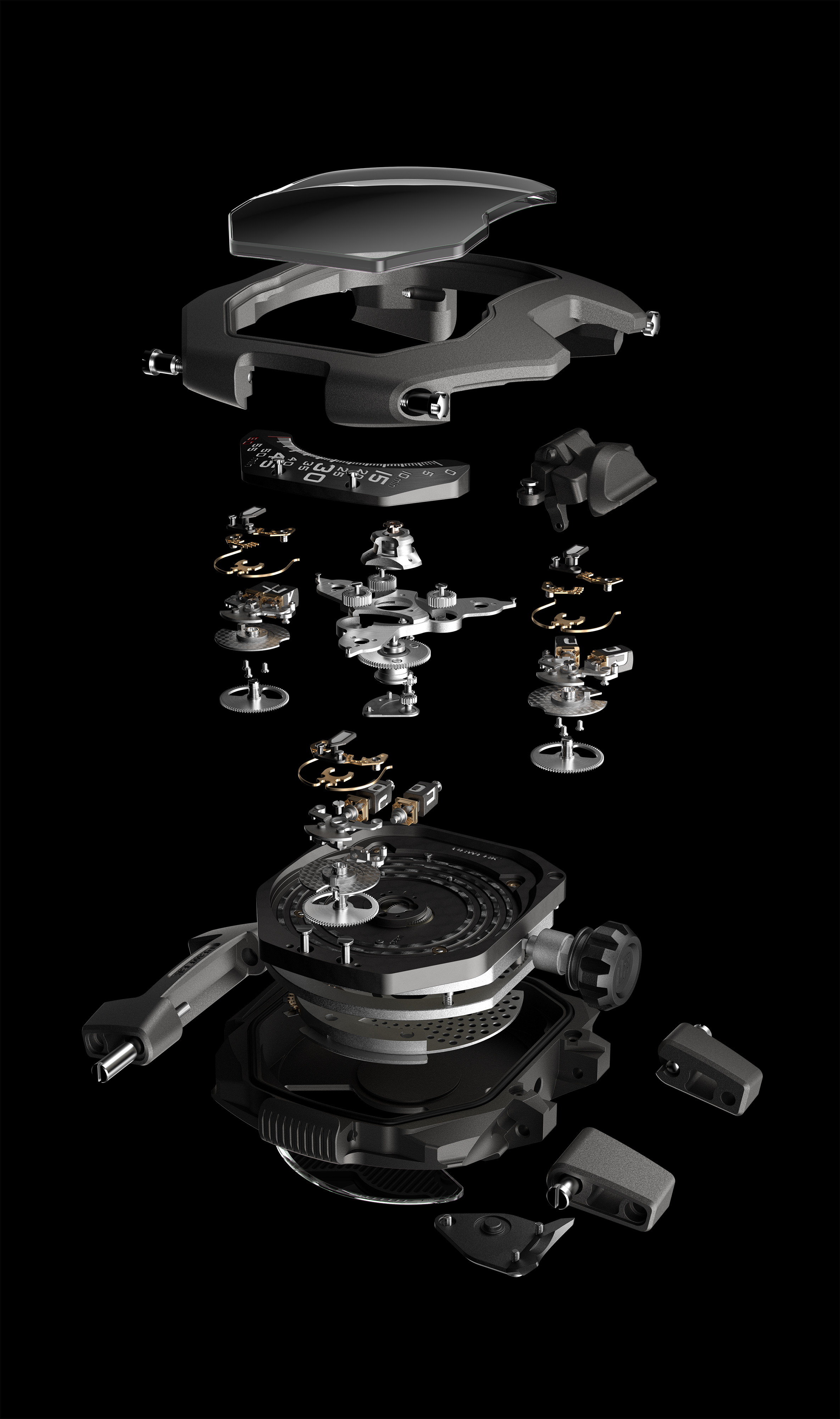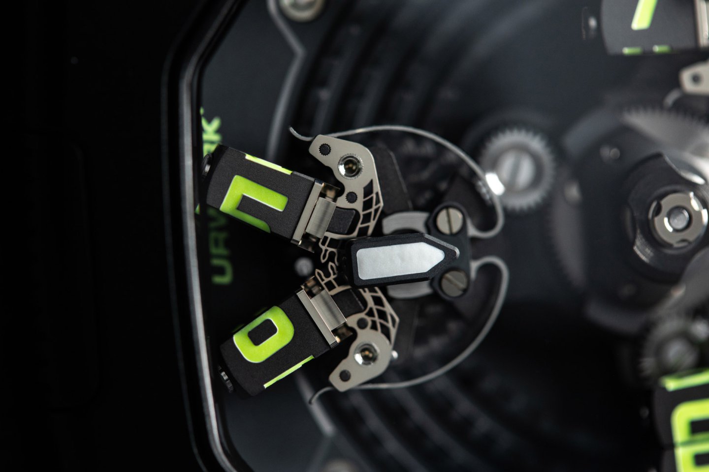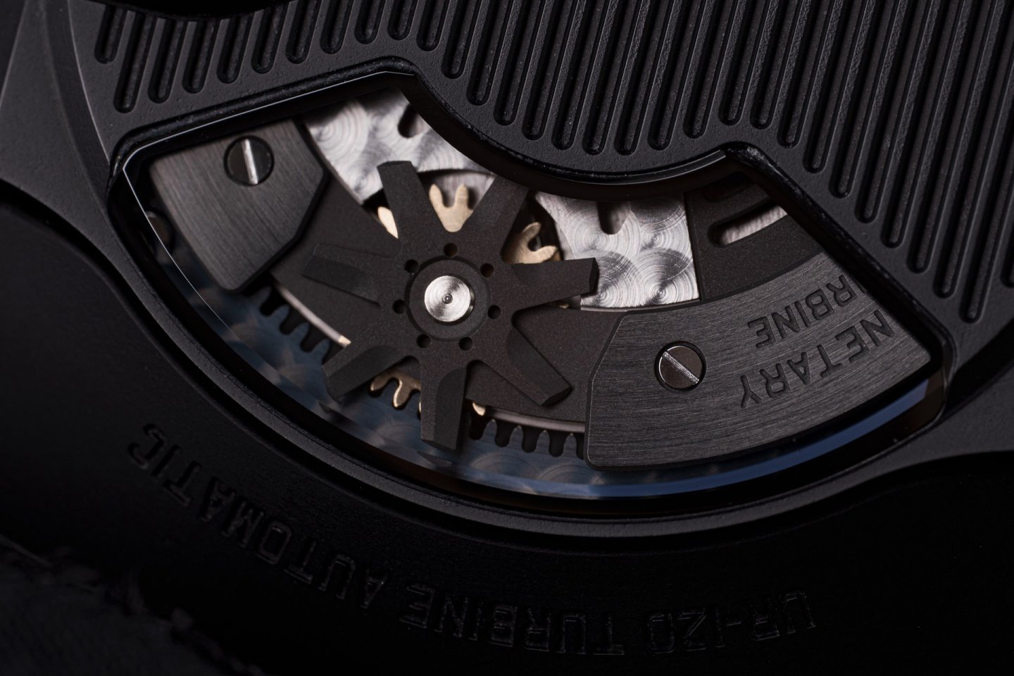 Inside the UR-20.01 caliber, the central carousel is fitted with three planetary gears, each one bearing a satellite.