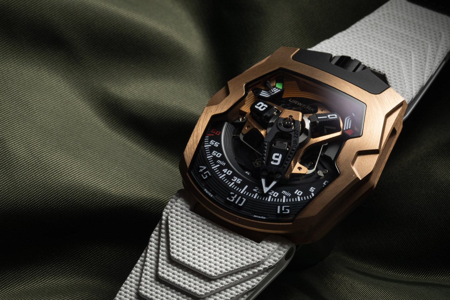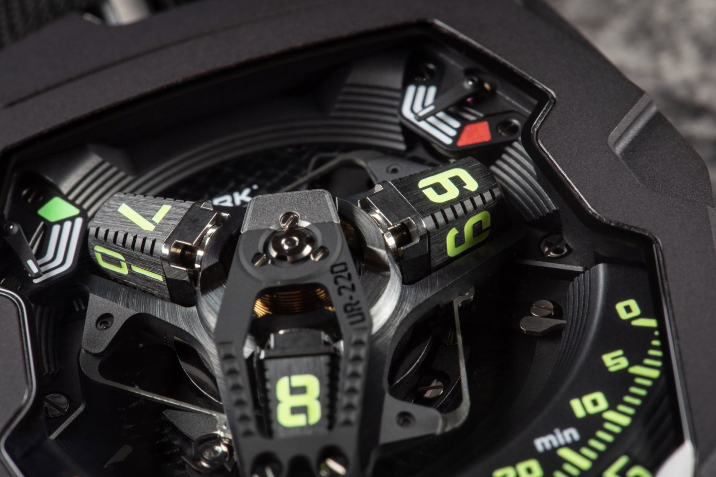 The UR-220 features a high-tech, oversized, three-dimensional retrograde minute hand. It encloses the hour satellite and indicates the time as it transverses the 0-to-60-minute scale. Then in less than 0.1 of a second the hand flies back to dock with the next hour satellite.