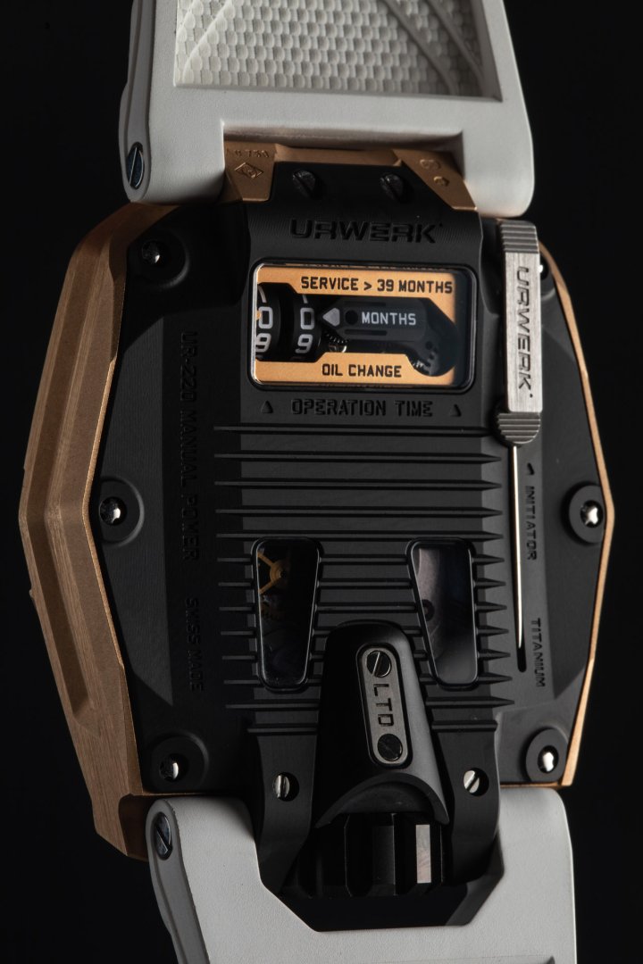 With its manually wound movement and control board on its back, the UR-220 goes back to URWERK’s earlier technologies in a case that is sleeker, more ergonomic and as stunning as ever. One exceptional feature is the return of the Oil Change indicator in a new guise. A limited production of 15 pieces every year!