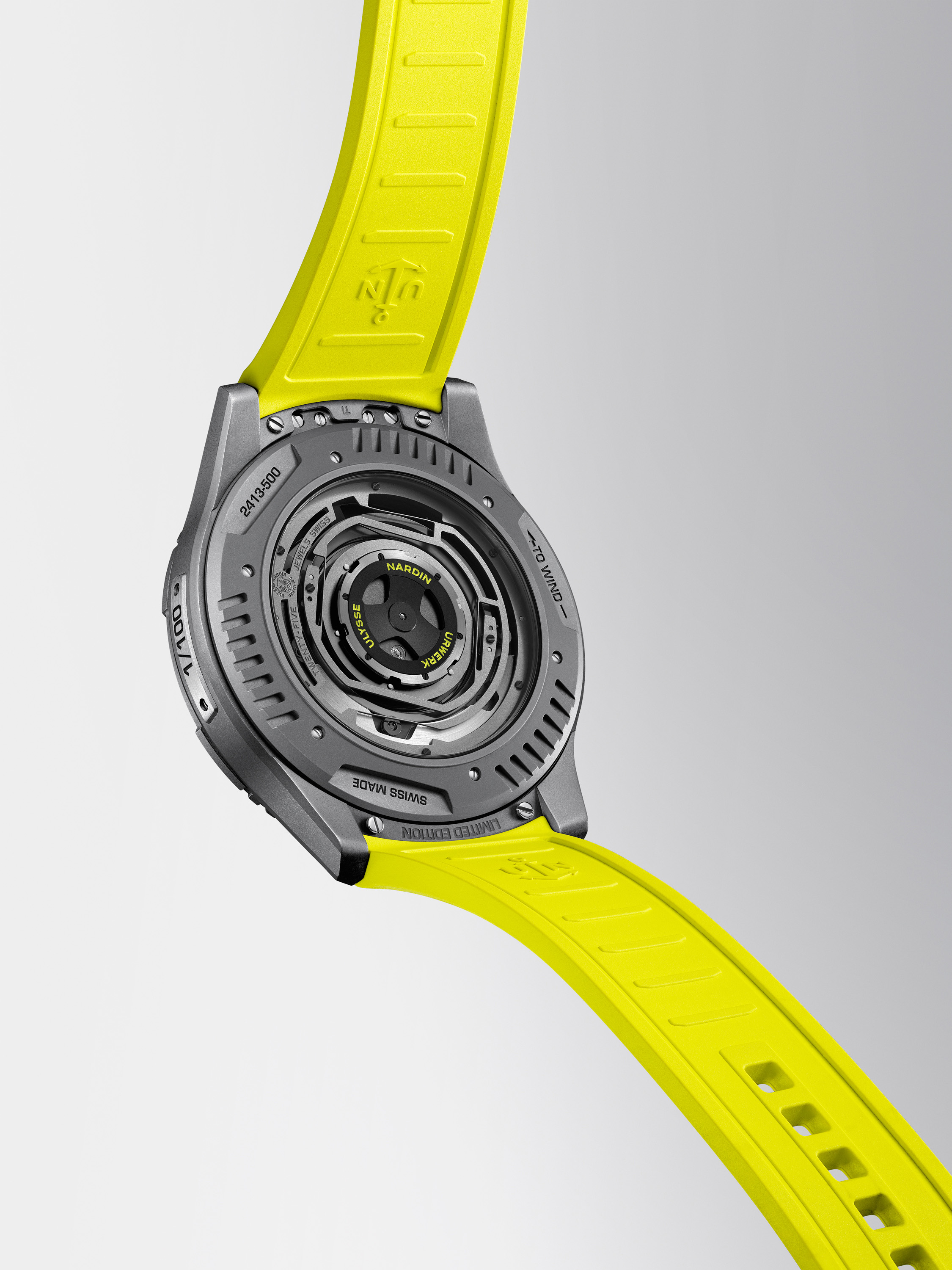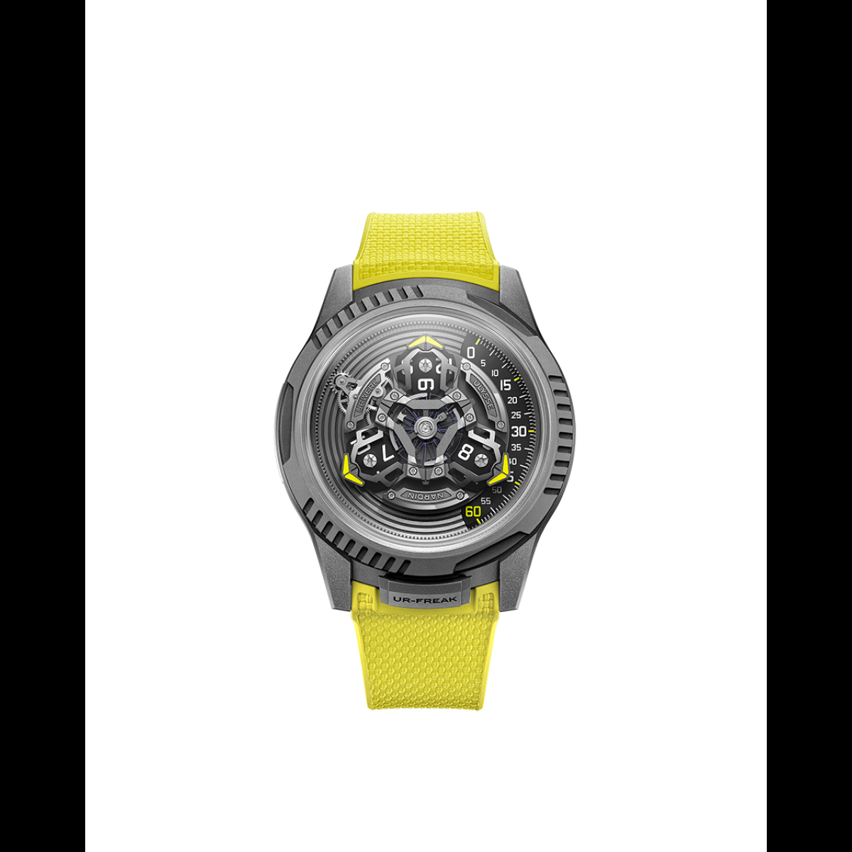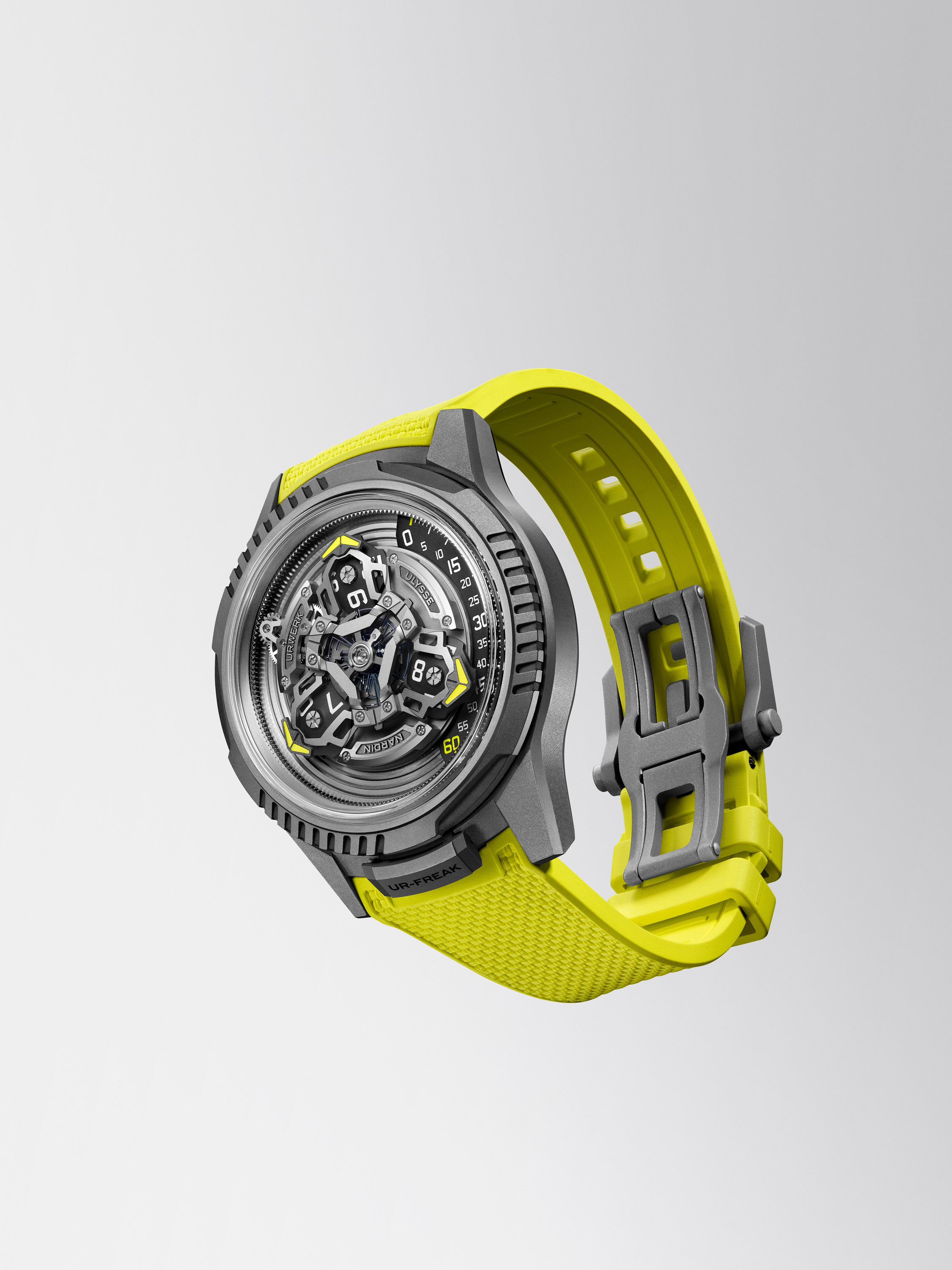 This limited edition bears unmissable URWERK hallmarks — a wandering hour satellite display, titanium architecture, and Super-LumiNova tracks glowing in the dark with Ulysse Nardin’s crownless Freak concept with its cutting-edge silicon technology, and one of the industry’s most efficient automatic winding technology— the patented Grinder®